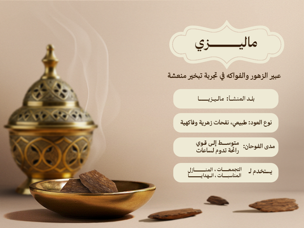 يأخذك عود ماليزي في رحلة عطرية غنية، تمتزج فيها النفحات الزهرية الحلوة مع لمسات فاكهية منعشة.